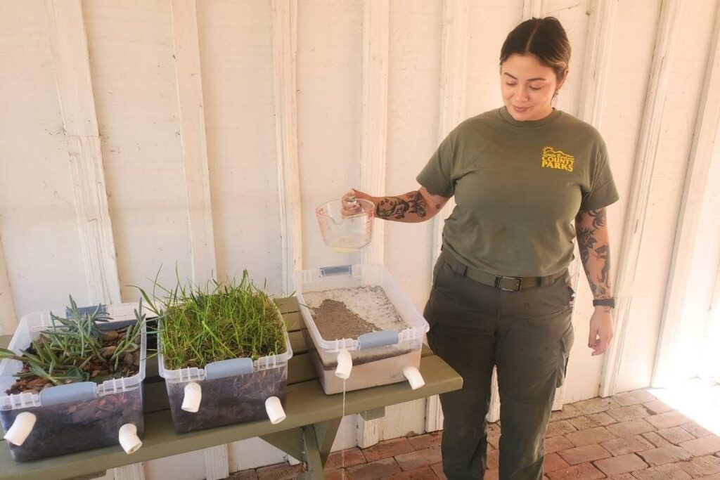 Using food coloring to demonstrate water pollutants, participants saw water flow across grass, concrete, and planted areas—discovering how healthy soil and vegetation naturally filter runoff while hard surfaces send contamination straight into our waterways. The activity was modeled after this educational video:
